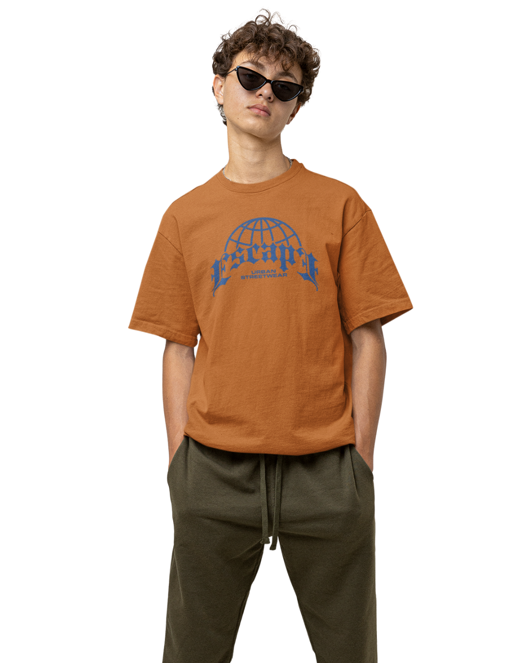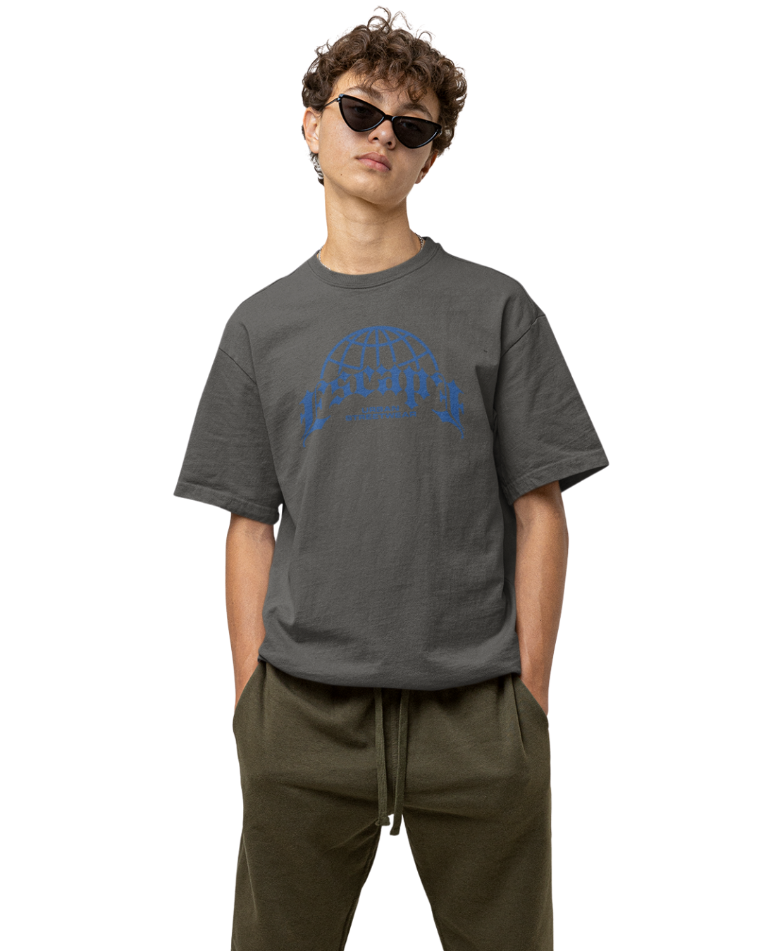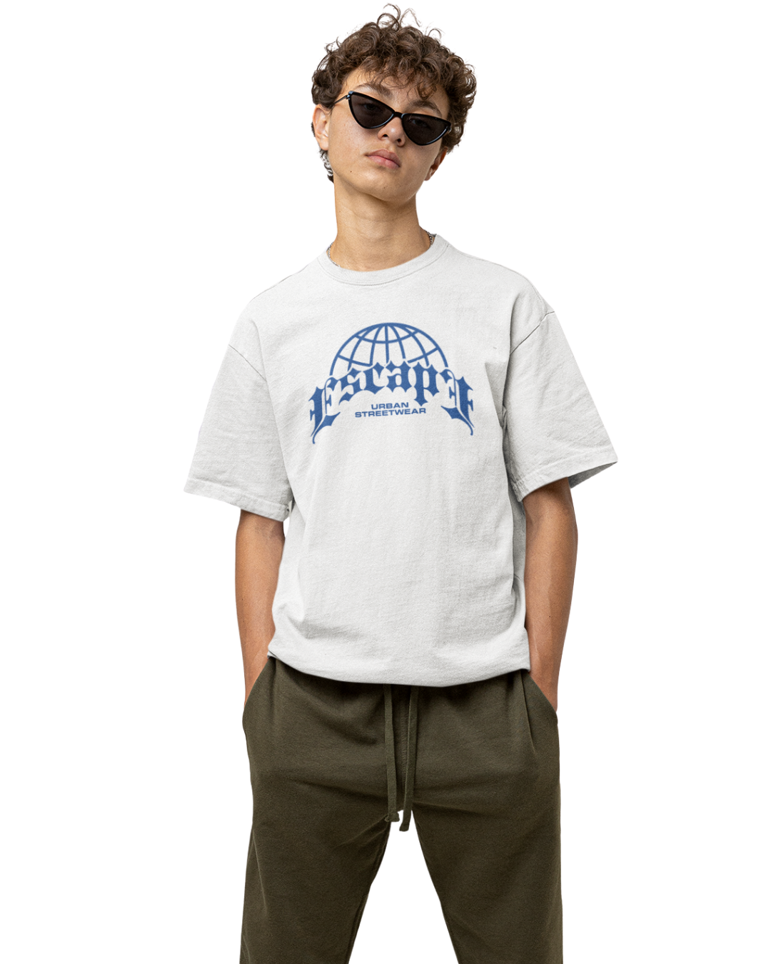 Camiseta Masculina “Escape Urban Streetwear”, conforto e autenticidade em 100% algodão premium, com estampa azul em estilo gótico e globo, unindo essência global e atitude urbana.